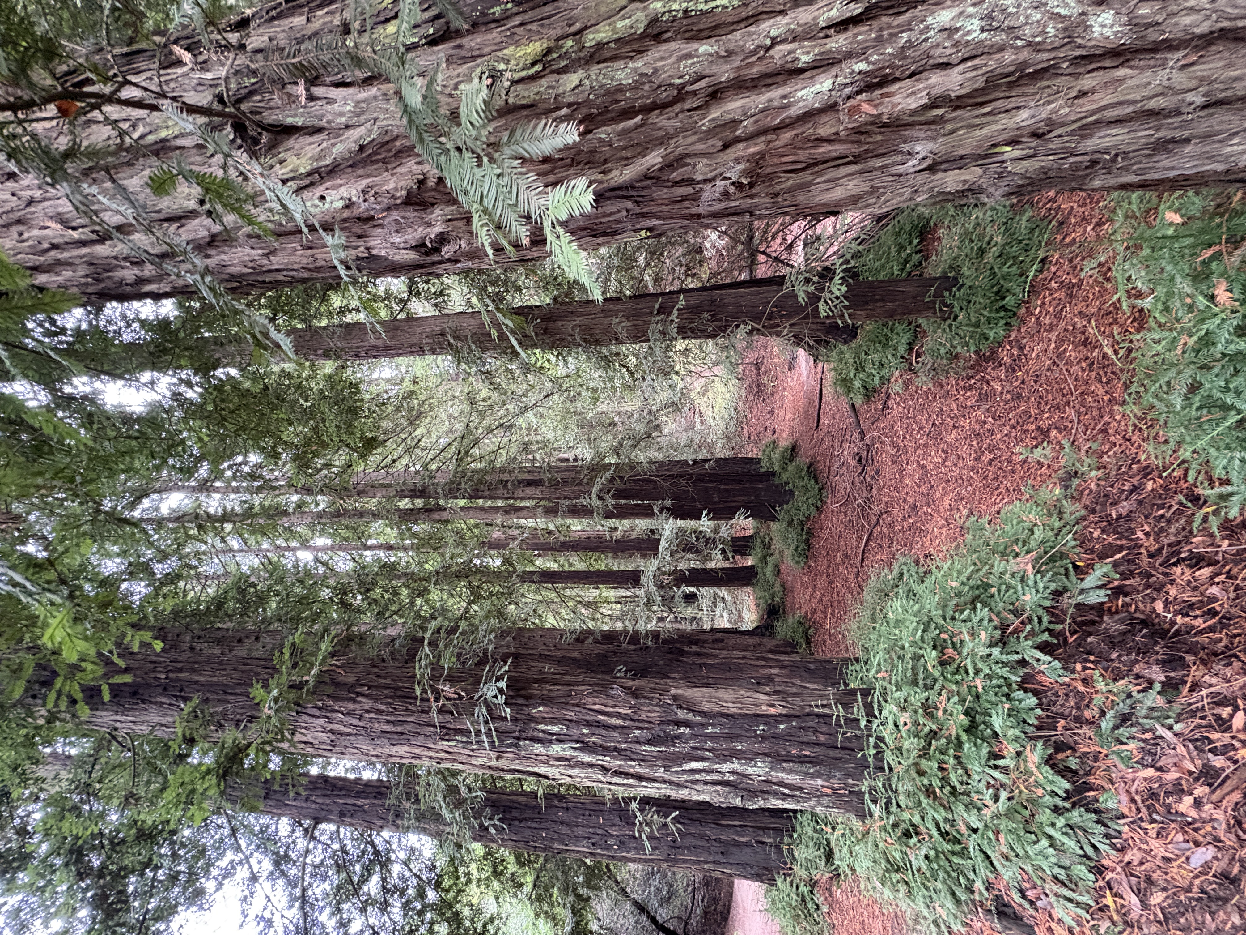 The first thing I notice is the quality of the air. Even as I climb out of the car, close the door, and reach for my key to lock it up, I am breathing in the cool, fresh air like medicine. The temperature feels cooler than at the coast, although it’s windy there. Humans are outnumbered in the forest, and I feel like the ratio of trees to mammals is such that there’s more oxygen in the mix. My lungs feel it immediately. It’s morning and early enough that the silence is here, too. The cool air and the vibrant quiet combine to give my brain a little caress. I experience a feeling of welcome, of belonging. Moving through the parking lot and onto the dirt path covered with pine needles, I barely notice the border of fallen branches and stones. My gaze wants to stay focused on Up. These majestic redwoods stretch to the clouds, dwarfing the few of us meandering in the grove. The bird song comes and goes, silence broken by a cacophony of excited news moving through the overstory. My eyes drink in the majesty of these 2,000-year-old trees.